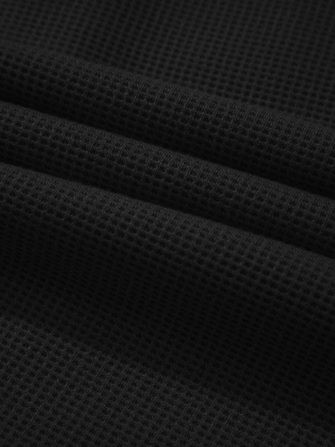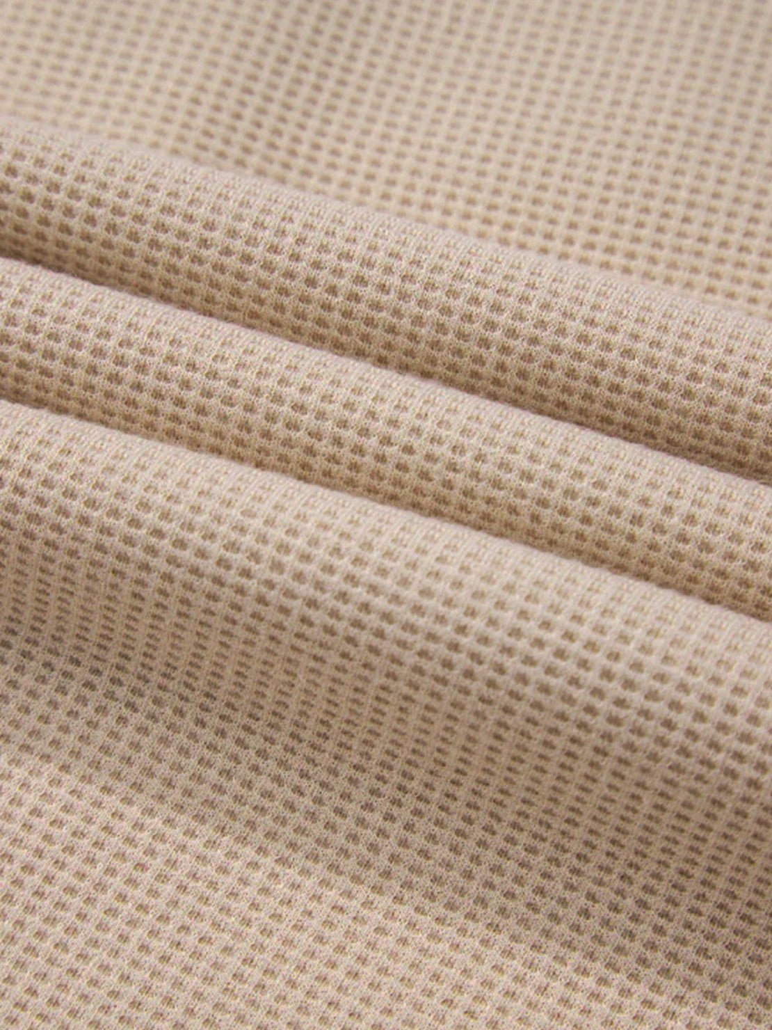 The waffle knit has a substantial, medium-to-heavy weight that feels quality and durable. It's not thin or see-through, but also not bulky. The texture adds dimension without extra bulk.