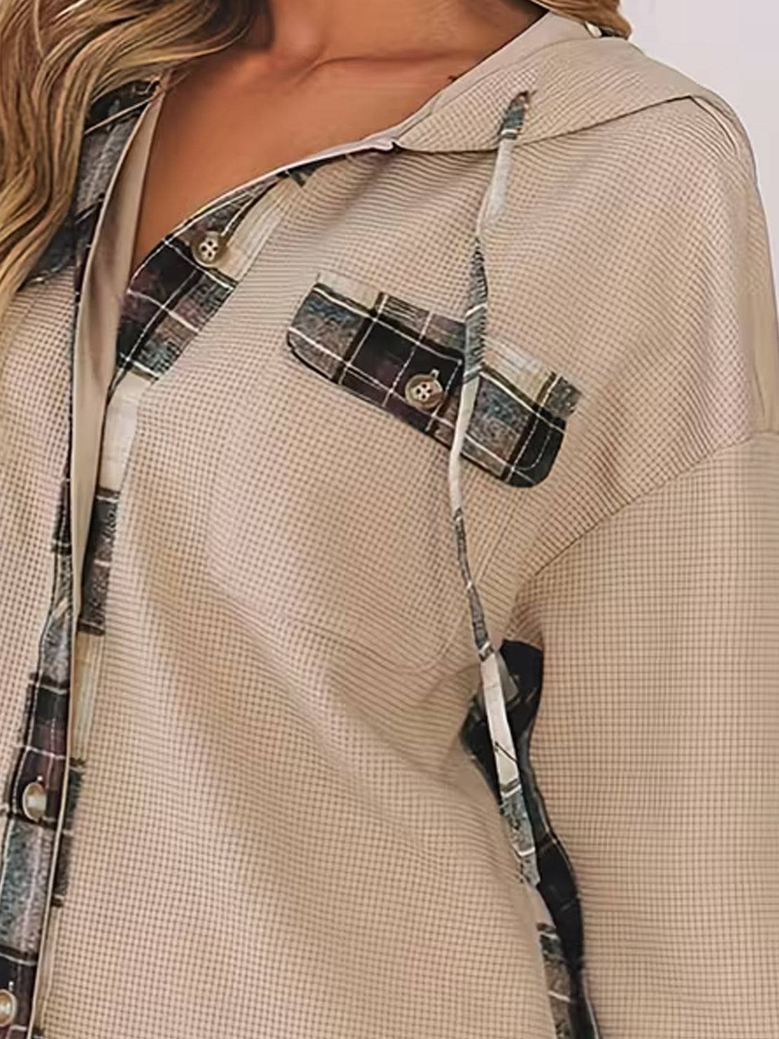 The hooded shacket falls to hip length with a relaxed drape through the shoulders. The waffle knit texture provides warmth without bulk. Intended for daily wear and layering over basics.