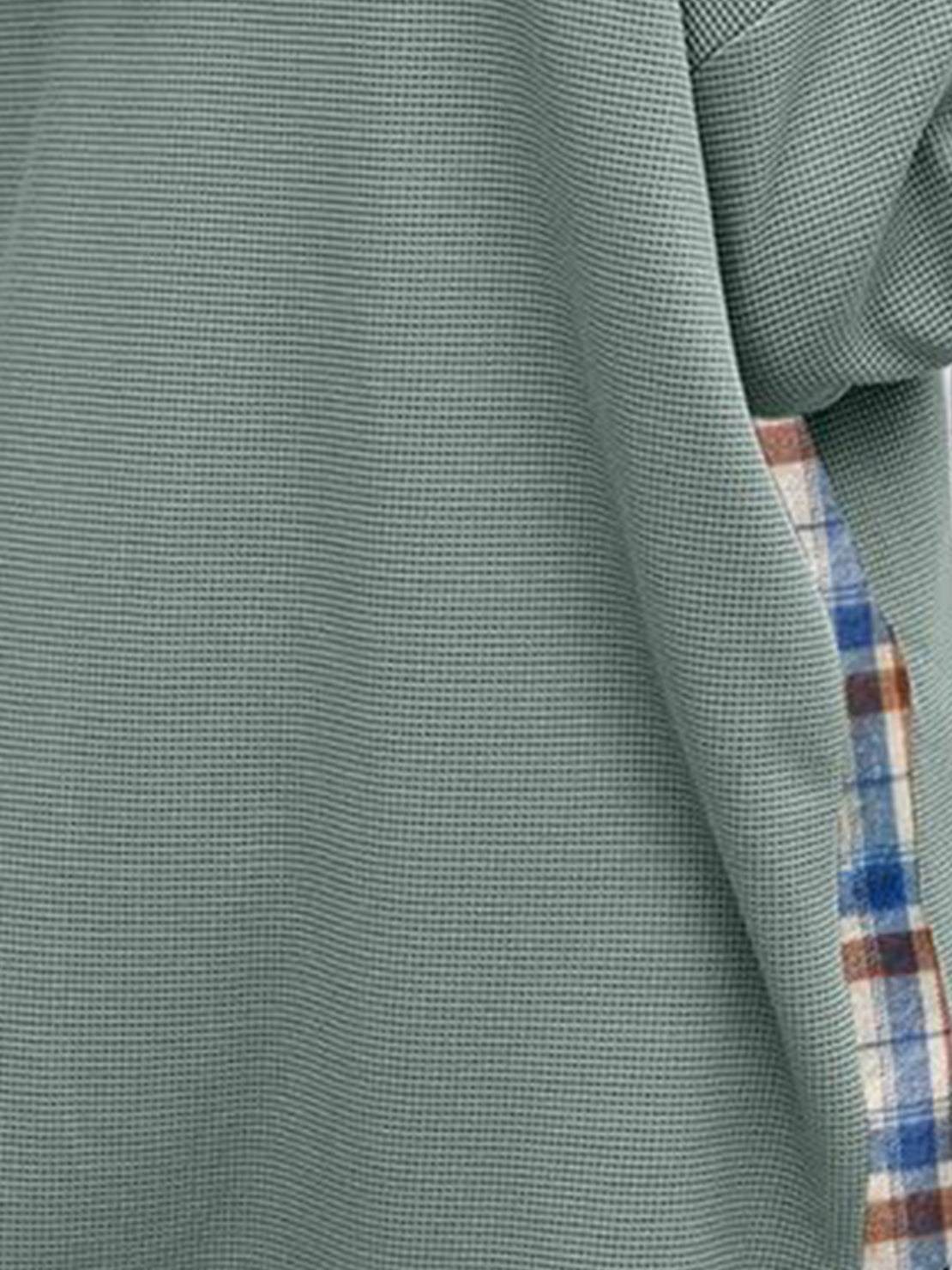 The plaid lining is visible at the front placket, around the chest pocket, and inside the cuffs. When you roll the sleeves, the plaid becomes more prominent. It adds visual interest without overwhelming the design.