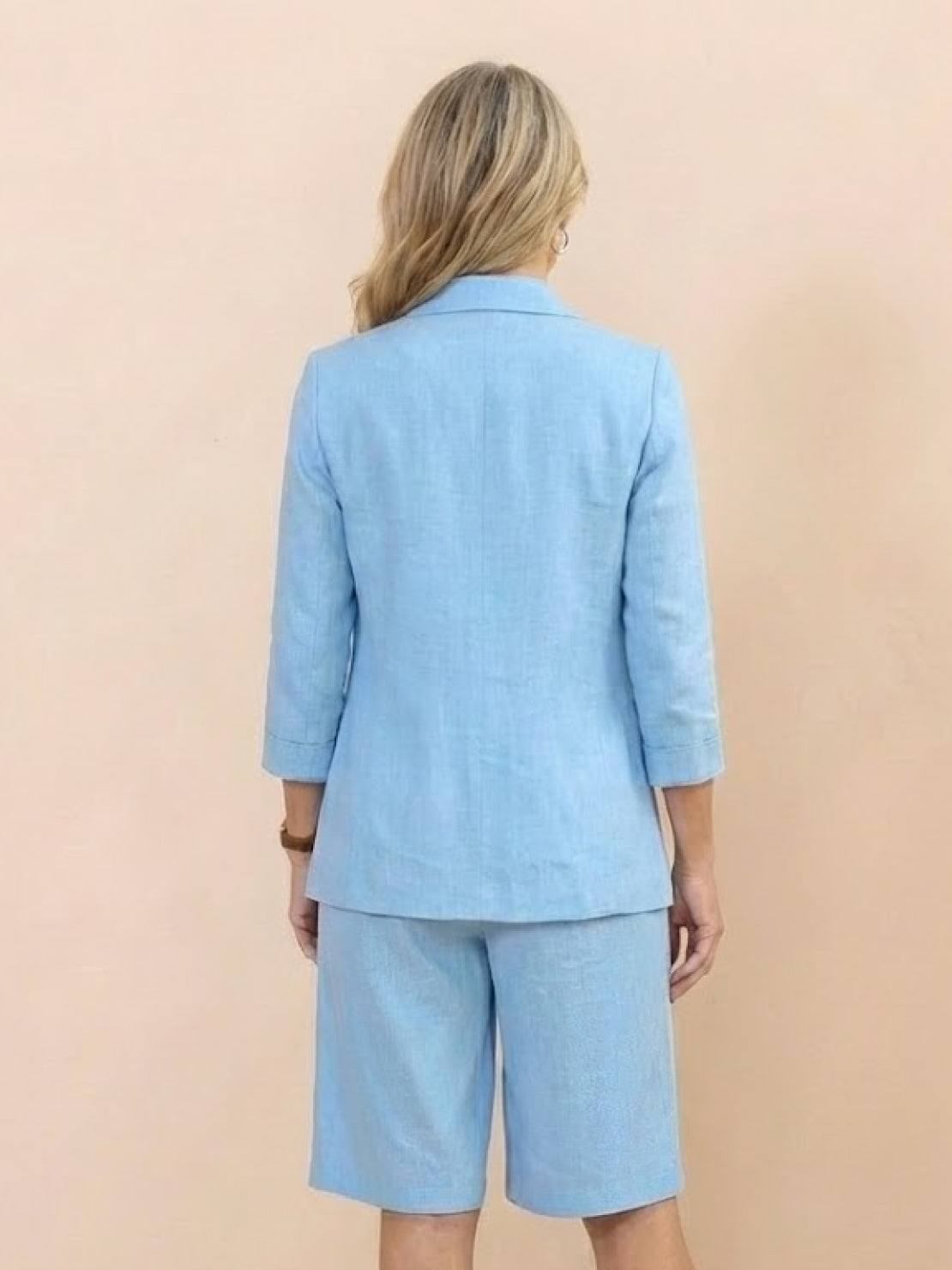 - Dignified but not Uptight: The classic collared blazer and knee-length, high-waisted shorts are classy and put-together, but the soft and natural fabric is friendly and approachable.